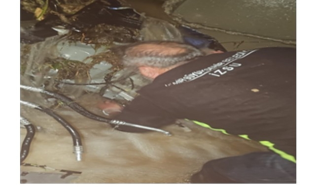 İzmir’de etkili olan sağanak yağışın ardından Kemalpaşa Ulucak’ta dört araç İncepınar Deresi’ne sürüklendi. Araçlardan biri menfezde sıkışırken, ekipler yeni yağış öncesi aracı çıkarmak için çalışmalarını sürdürüyor.