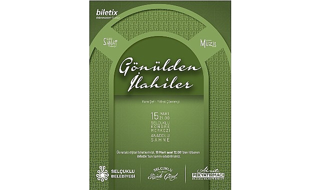 Sanat Akademisi bünyesinde eğitim alan kursiyerlerin sahne alacağı konserde, tasavvuf musikisinin sevilen ilahileri seslendirilecek. Birbirinden değerli eserleri dinleyiciyle buluşturacak ve manevi atmosferiyle katılımcılara huzurlu bir akşam yaşatacak olan konser, Selçuklu Kongre Merkezi Anadolu Sahne’de 15 Mart Pazar günü saat 21.00’da gerçekleştirilecek.